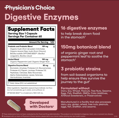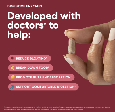 Physician's Choice Digestive Enzymes provide a dual-actionsolution for meal-time discomfort and temporary bloating